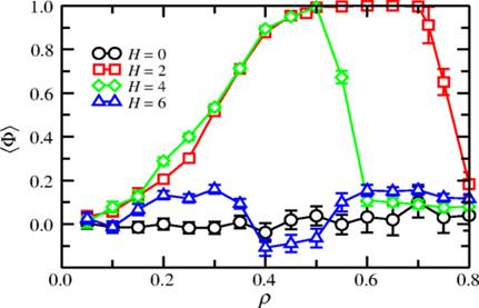 FIG. 4. Average order parameter as a function of the particle density, for θ=0b=8vd=6, and various values of the depth Hof the serrated region.