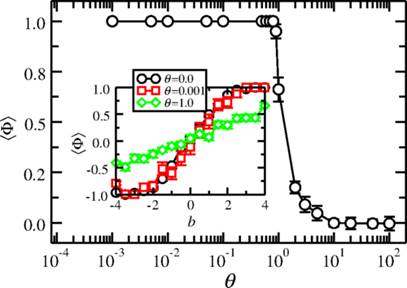 FIG. 5.Average order parameter as a function of θ, for ρ=0.6, b=8, vd=6, and H=2. The inset shows the crossover from Φ=−1 to Φ=1 as b changes from −8 to 8, for different values of θ.