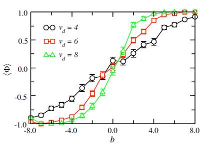 In Fig. 2, we show, for different drift velocities in systems without noise, how the degree of asymmetry b changes the lanes and induces preferential sides of the particle flows in the channel. Interestingly, the larger , the more abrupt the change between the ordered states, , as b changes. For large positive values of b, we find; i.e., everybody is keeping left perfectly. For large negative values of b, we find , corresponding to everybody keeping right. Finally, there is a mixed state for b close to zero, where no preferred side is observed.
