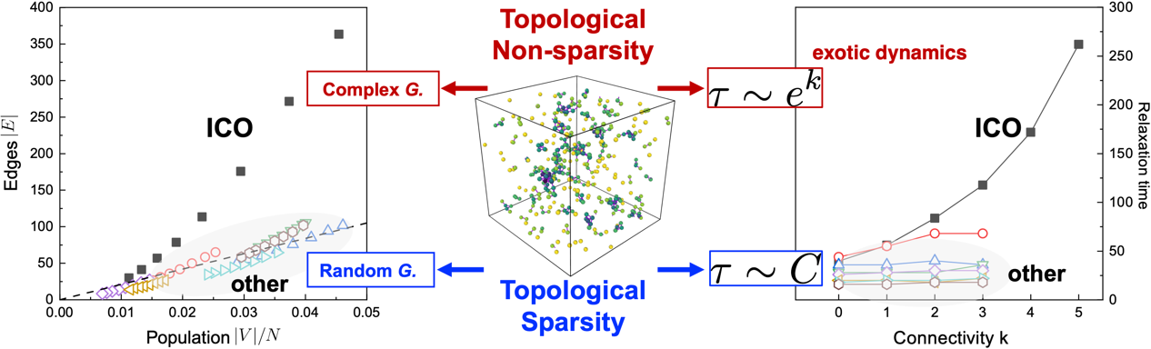 图2. 图-动力学对应关系。在二十面体网络(ico-networks)中,其网络结构拓扑特征与内部组成部分的局部弛豫动力学以及输运行为之间存在显著联系。然而,这些ico网络中某些主要全局拓扑特征的本质及其形成机制仍然不清楚。值得注意的是,有证据表明,网络中节点的动力学行为与其所处网络结构的整体拓扑稀疏性密切相关(