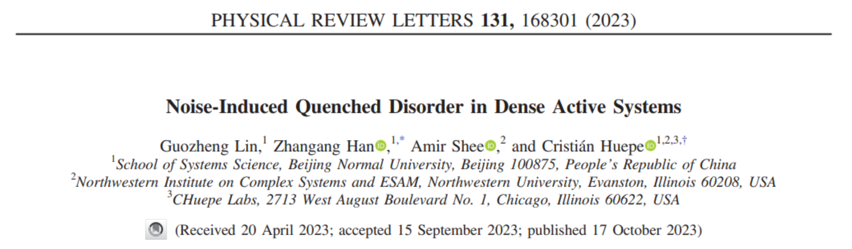 近期,Physical Review Letters 期刊发表了题为“Noise-Induced Quenched Disorder in Dense Active Systems”的论文(如图1所示),发现由相互排斥的个体组成的密集集群系统能够产生一种新的淬火无序态 (Quenched disorder),该状态展现出短程的有序和长程的无序,与在复杂系统中被长期研究的自旋玻璃态类似。该论文以太阳集团tyc151cc为第一单位,由太阳集团tyc151cc韩战钢教授作为通讯作者、林国政博士作为第一作者,联合了美国西北大学的 Cristian Huepe 研究员(共同通讯作者)和Amir Shee 博士后,于 2023 年 10 月 17 日上线于 Physical Review Letters 期刊官方网站。