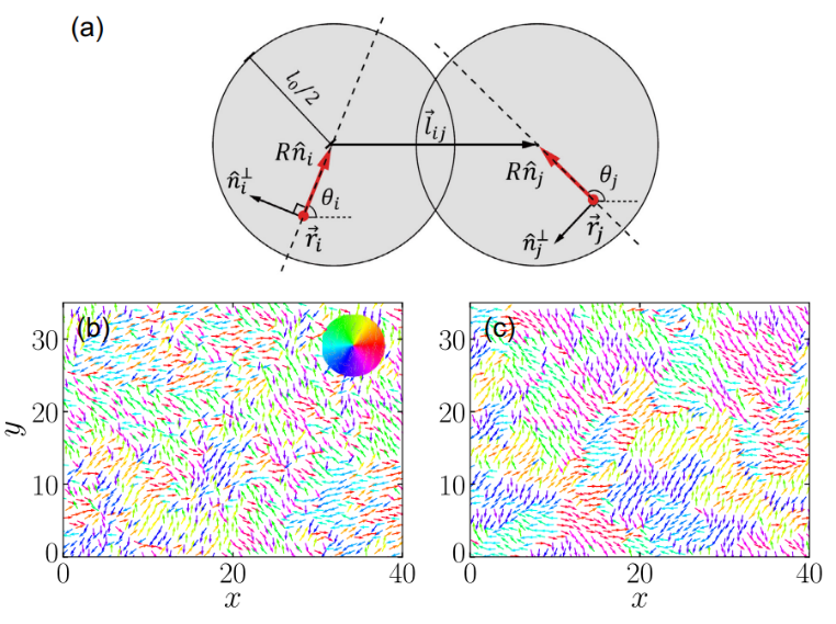 论文建立了一种具有一般性的自驱动粒子模型,其中个体被看作具有自驱动能力的圆盘,圆盘之间相互碰撞产生的弹性力决定其平移运动和转动,如图2(a) 所示。该模型的一般性体现在:一是圆盘绕偏心转动(图2(a) 中红色箭头的起始端为个体转动中心),解除了大多数模型中个体需严格绕几何中心转动的限制;二是圆盘之间仅具有相互碰撞而产生的弹性排斥力,这种机制几乎在所有的集群系统中都存在。因此该模型对各种集群系统的共性进行了统一描述。