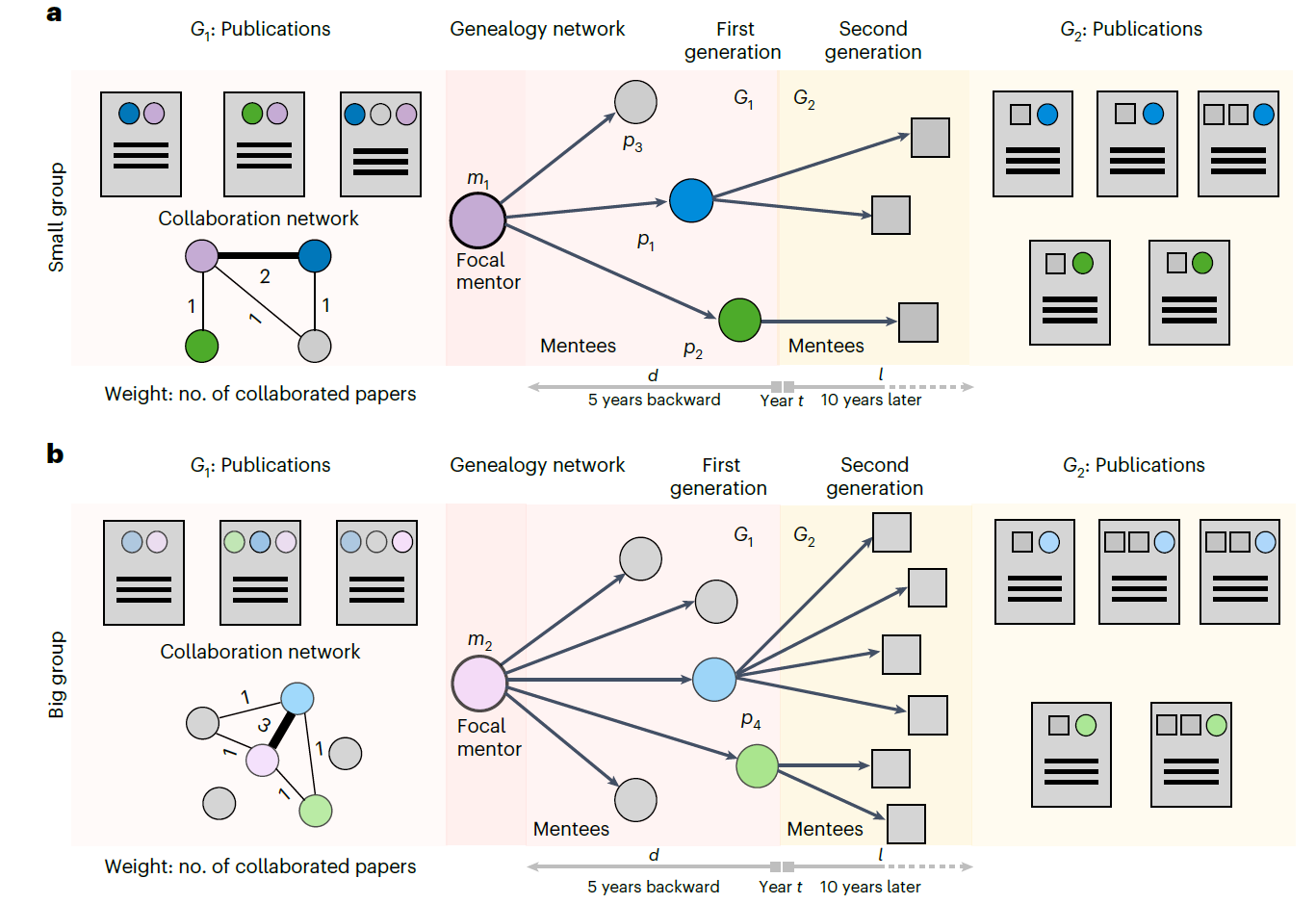 图1,本图对比展示了大、小导师团队的学术传承差异:上图中小规模团队(m1)通过紧密合作培养出50%的持续活跃学者,而下图中大规模团队(m2)虽形成密集合作网络,却仅有25%学生保持学术活跃度。紫色辐射网络揭示核心发现——团队规模扩张虽提升短期产出,但导致超半数人才中期流失,凸显学术培养规模效应与可持续性的根本矛盾。