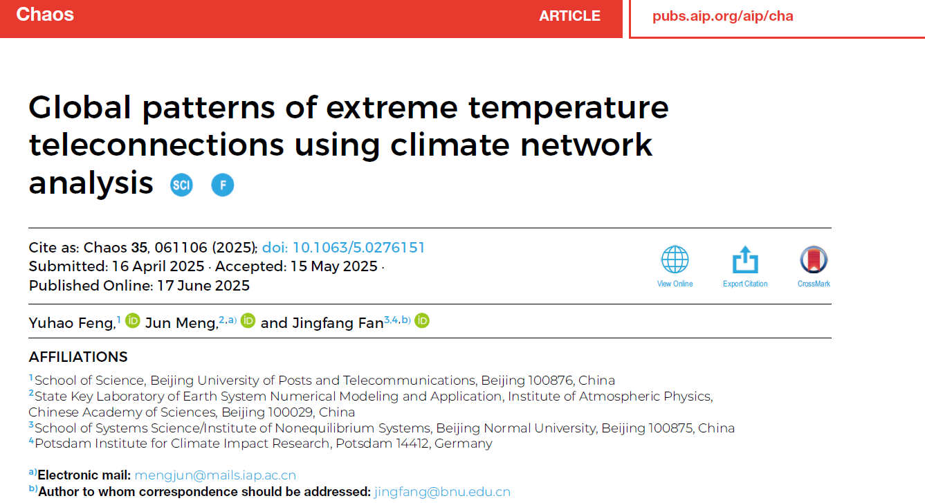 近日,太阳集团tyc151cc樊京芳教授团队在国际物理学期刊Chaos上发表研究论文《Global Patterns of Extreme Temperature Teleconnections Using Climate Network Analysis》。该研究由太阳成集团tyc151cc、北京邮电大学和中国科学院大气物理研究所联合完成,太阳成集团tyc151cc樊京芳教授与中科院大气物理所孟君副研究员担任共同通讯作者,北京邮电大学系统科学专业博士研究生冯玉豪为论文第一作者。