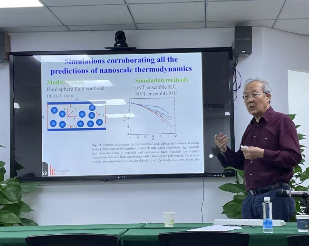Wei Dong研究员细致地介绍小体系热力学,并分享了最新的研究成果。小体系热力学是由美国科学院院士Terrel Hill在上世纪60年代提出,然而由于该理论中新引入的热力学量难以在实验上定义,目前仍缺乏实验验证。近期董教授通过引入积分和微分表面张力等实验可测的热力学量,成功将吉布斯的界面热力学理论推广到纳米尺度。该方法为研究小体系热力学提供了另一种途径,该理论同样发现了Hill所预言的在小体系中系综之间不再具有等价性,且该理论所提出的新概念均为实验可测量。